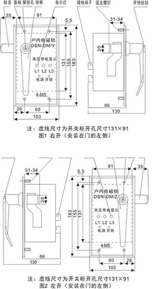 注:所謂左側(cè)安裝或右側(cè)安裝,系指操作者面向鎖定對象(如操作桿,柜體固定部分),所對應的安裝位置。當電磁鎖在鎖定對象上的安裝位置,位于操作者面向的左側(cè)時即為左側(cè)安裝,反之,即為右側(cè)安裝。