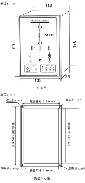 注意:本產(chǎn)品需在柜門上開具尺寸為179±0.5mm橫寬119±0.5mm矩形孔,并在矩形孔的四角開具4個(gè)圓孔(孔徑φ5詳見安裝尺寸圖)作為固定本產(chǎn)品用。