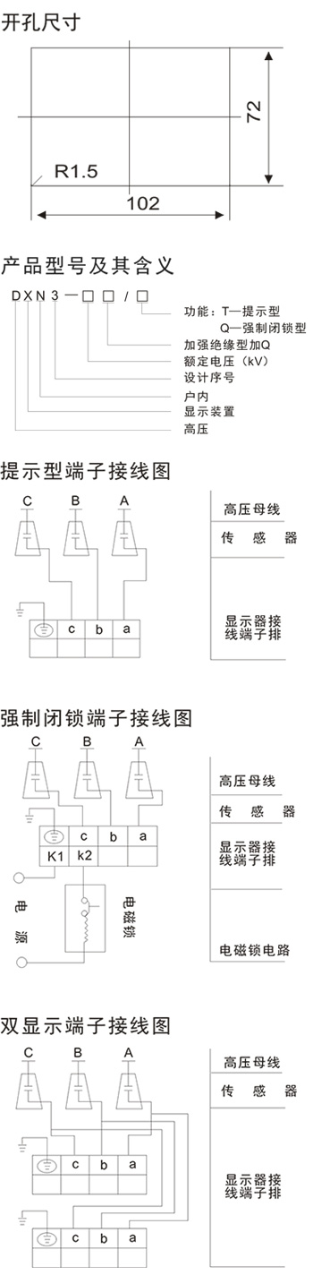 DXN(GSN)系列戶內(nèi)高壓帶電顯示裝置由三個(gè)傳感器和一個(gè)顯示器經(jīng)導(dǎo)線連接組成。適用于額定頻率50Hz,額定電壓40.5kV以下的戶內(nèi)高壓電氣設(shè)備上,既可反映回路帶電狀況,還可與電磁鎖配合,實(shí)現(xiàn)強(qiáng)制閉鎖開關(guān)手柄、閥門等。帶電顯示和強(qiáng)制閉鎖均受同一高壓信號(hào)所控制,但電路系統(tǒng)又是相互獨(dú)立、互不干擾,只要高壓回路帶電,即使顯示電路和閉鎖電路同時(shí)出故障,電磁鎖仍處于閉鎖狀態(tài),達(dá)到防止誤操作,誤入帶電間隔。